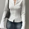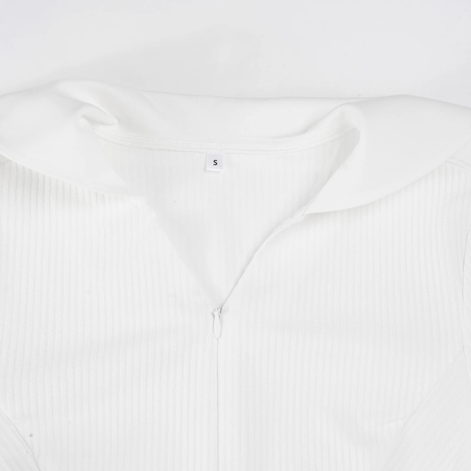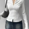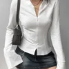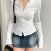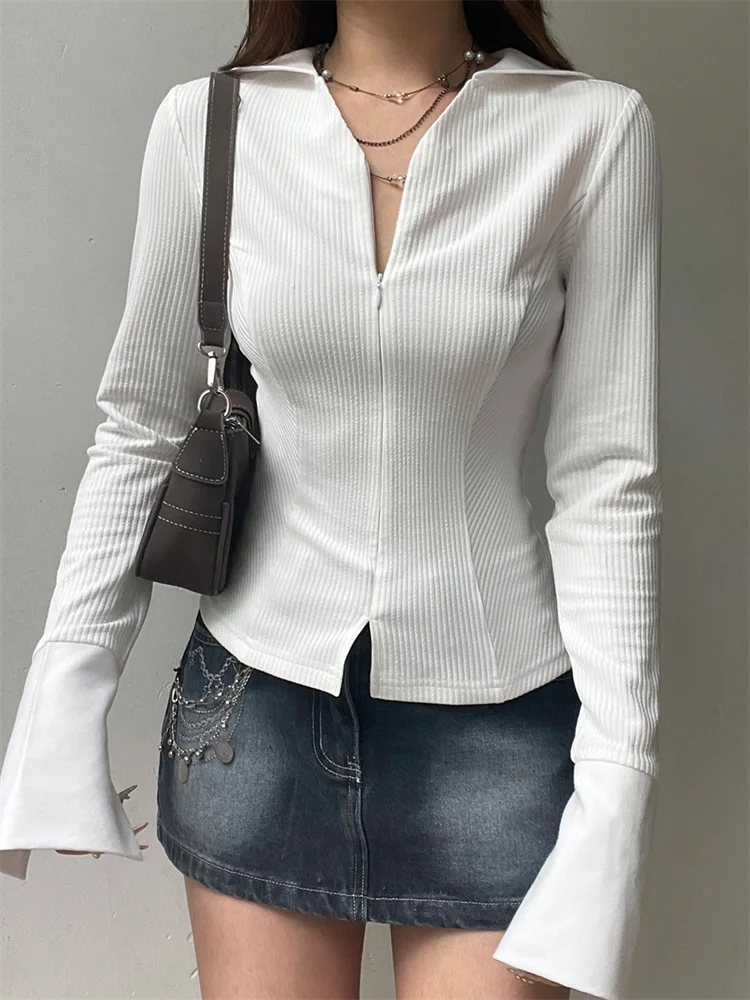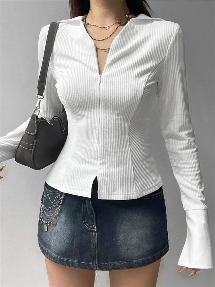Women’s Solid Color Shirts Zip Up Lapel Cardigan Long Sleeve Knit Tops for Spring Autumn Daily Office Wear