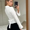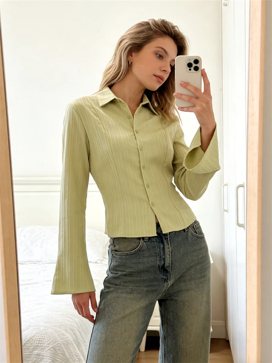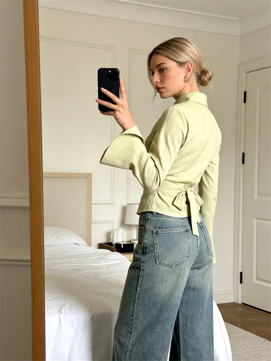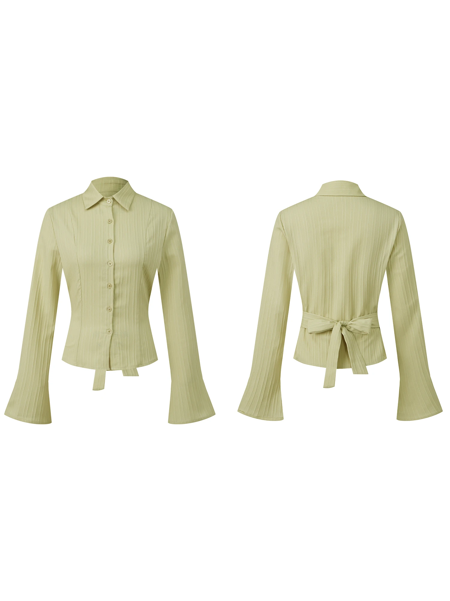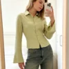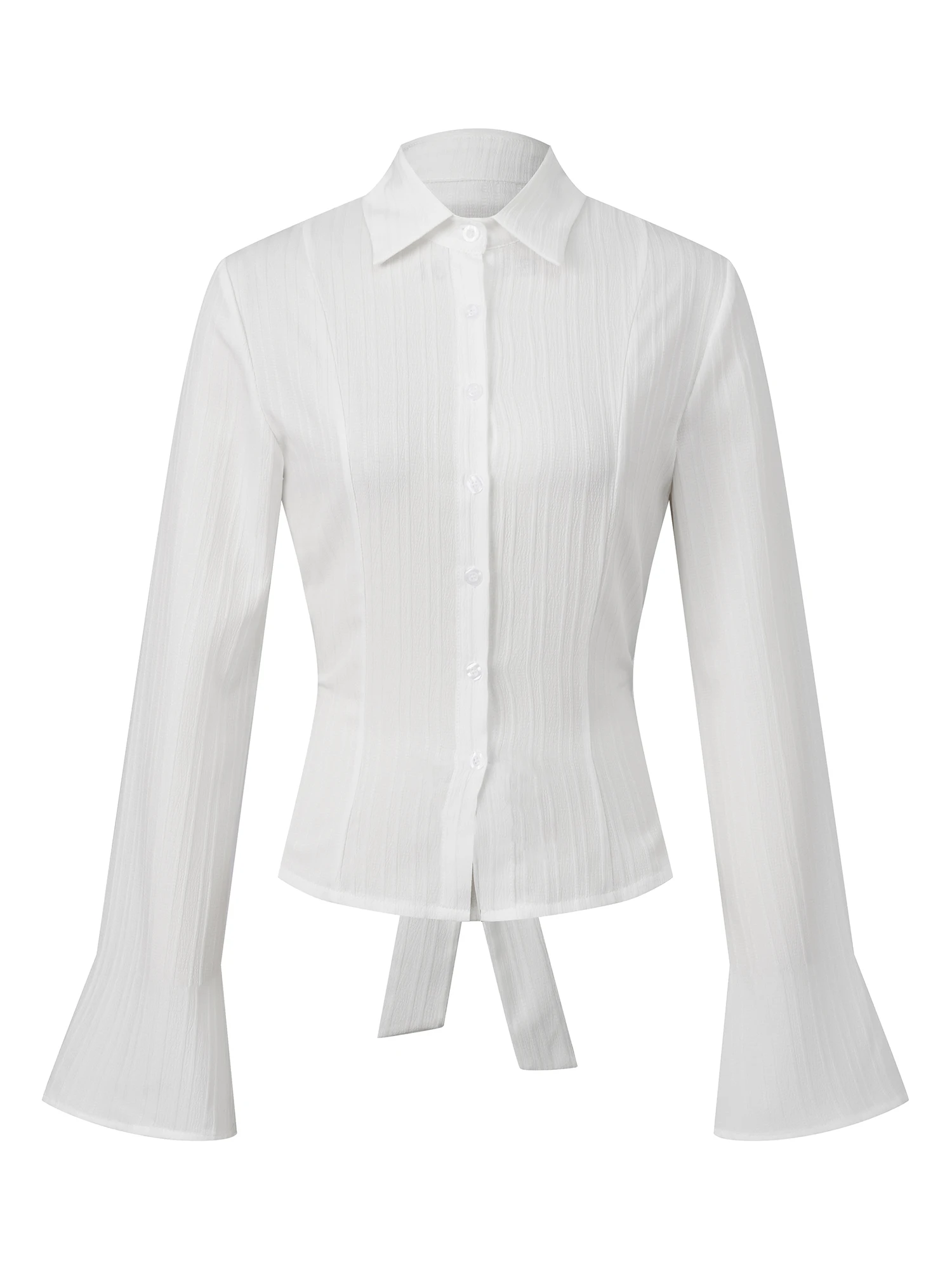 Women’s Textured Fall Shirts Fashionable Solid Color Long Sleeve Tie Up Back Button Down Blouse