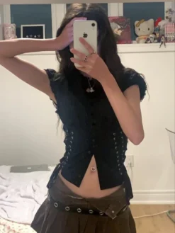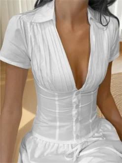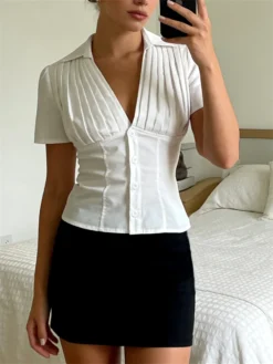 2025 Summer Blouse Short Sleeve V Neck Button Up Bandage Slim Crop Tops Lace Trim Casual Fairycore Grunge Y2K Retro Shirts