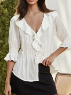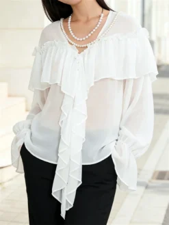 Women Long Sleeve Shirts Chiffon See Through V Neck Ruffle Tops Spring Summer Vinatge Casual Blouse Streetwear