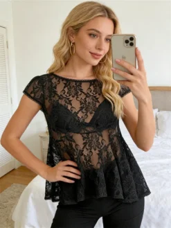 Women’s Flower Lace Blouse Short Sleeve Round Neck Shirts for Casual Daily Wear See-through Cover-ups Tops