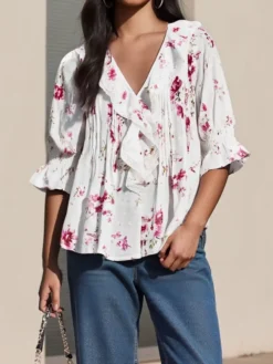 Women’s Ruffled V Neck Blouse Loose Fit Solid/Floral Print Button Down Elbow Sleeve Tops Summer Fall Elegant Shirts
