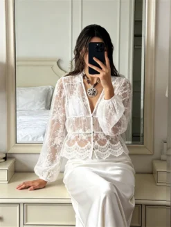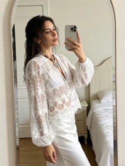 Women’s Flower Lace Tops Long Lantern Sleeve Button Down V Neck Loose Fit Shirts See Through Sheer Casual Cover-ups Blouses